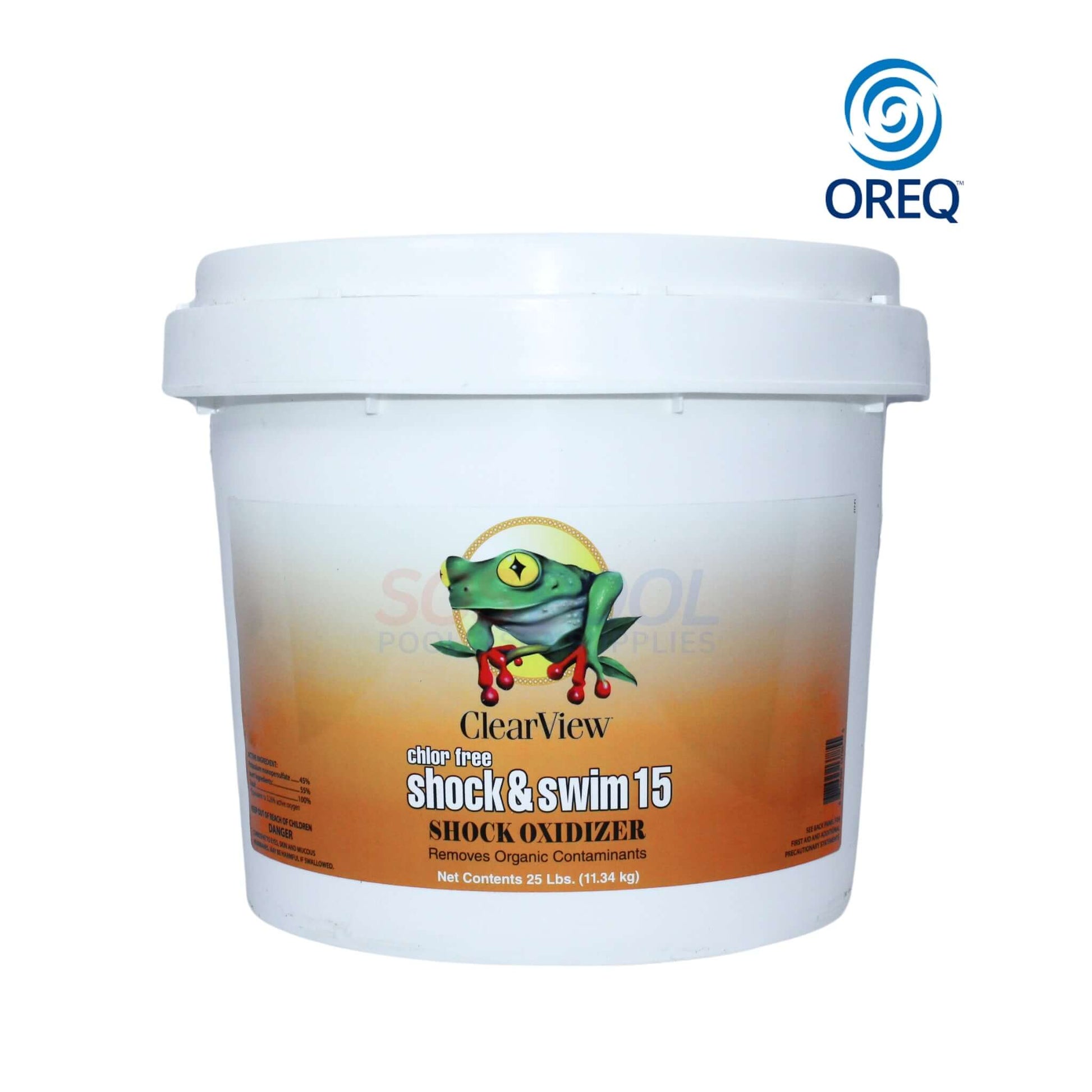 ClearView Chlor Free Shock & Swim 15 Shock Oxidizer CVCF025 is a 25 lbs fast-acting oxidizer designed to effectively eliminate contaminants and organic waste from pool and spa water. This chlorine-free formula enhances water clarity and freshness while reducing unpleasant odors and irritation. Its powerful oxidation process breaks down oils, lotions, and other unwanted compounds, improving the efficiency of sanitizers. The convenient 25 lbs container allows for precise application, making it easy to maintain a clean and balanced swimming environment. Regular use of ClearView Chlor Free Shock & Swim 15 helps keep pool water clear, safe, and inviting without the use of chlorine.